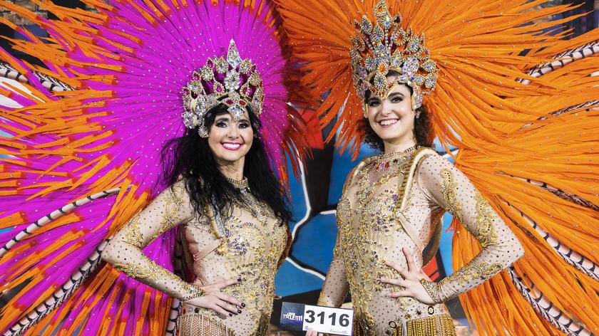 bogato zdobione stroje pełne cekinów, piór i dżetów, sprowadzane prosto z Brazylii.